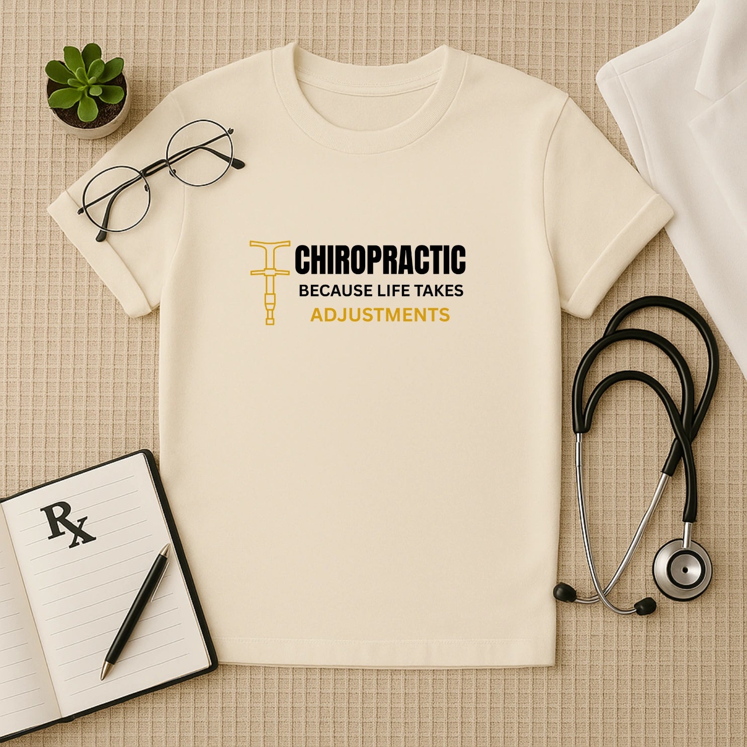 Celebrate the core of chiropractic care with our "Adjustments" T-shirt. This design features a stylized graphic of a chiropractic adjustment tool, a symbol of the precision and care that you bring to your practice. It’s a clean and professional tee, perfect for wearing your passion and your tool of the trade.