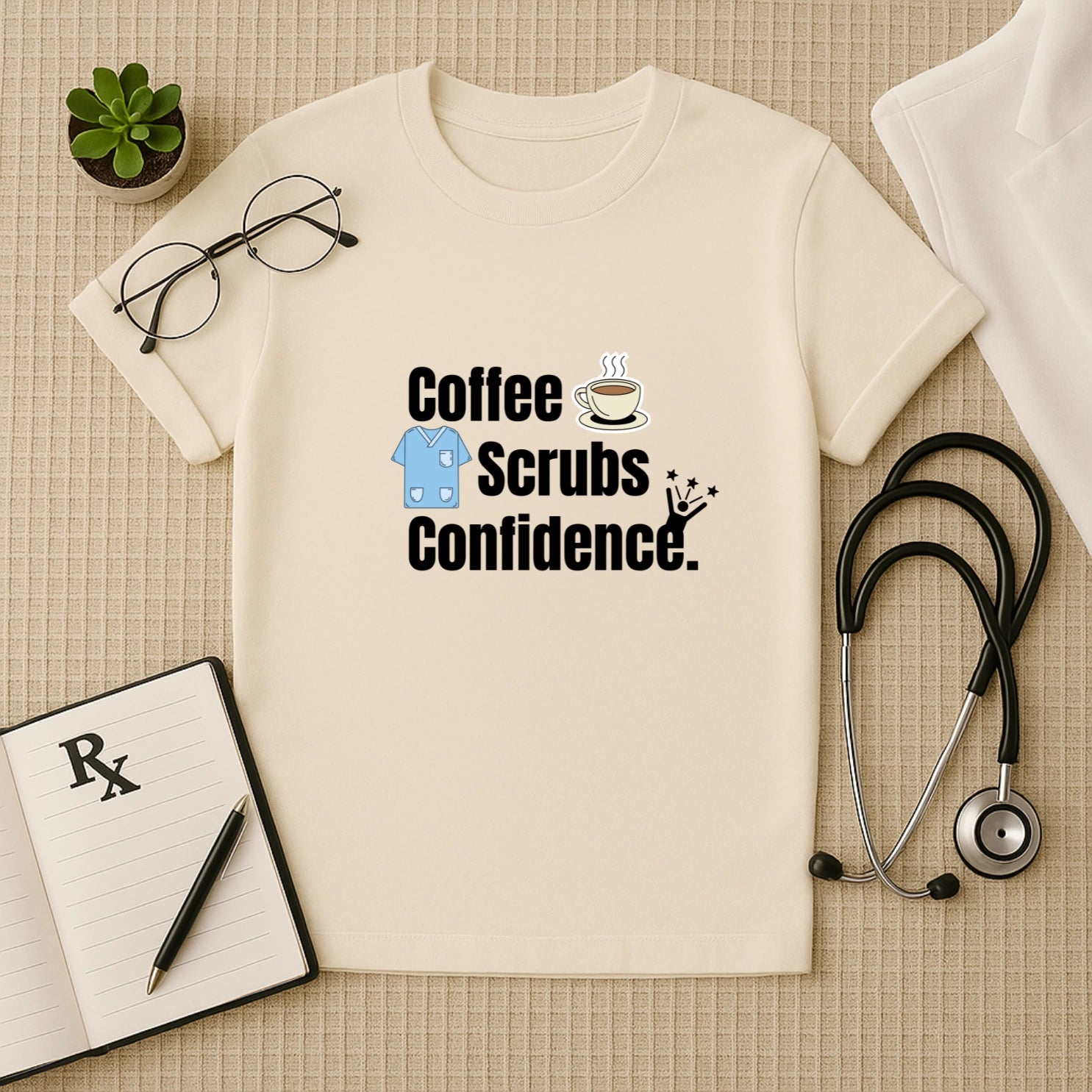 - Relatable "Coffee Scrubs Confidence" Design – Features fun icons for coffee, scrubs, and a triumphant figure, capturing daily life.