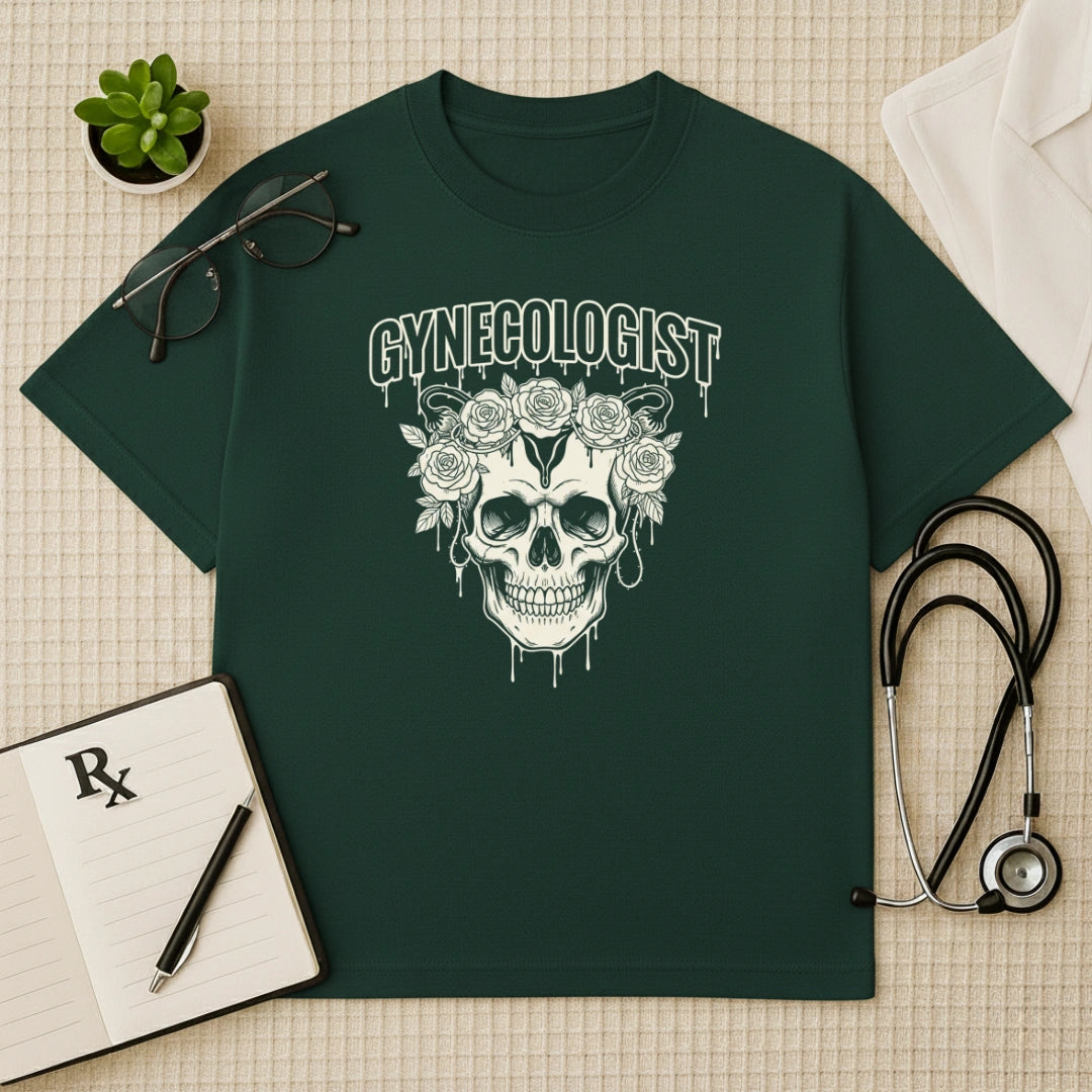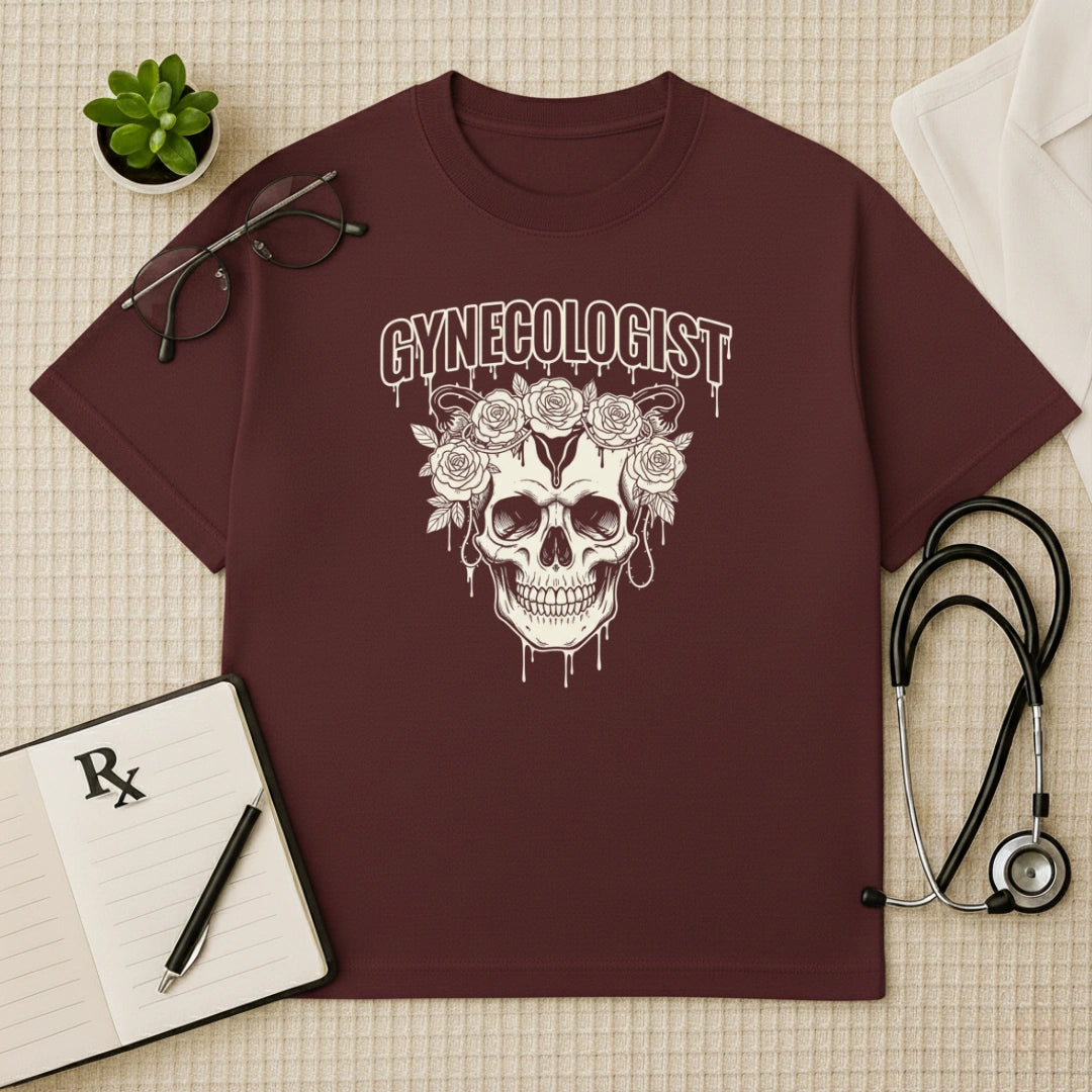 Command respect with the Gothic Floral Skull Tee. This Gynecologist Oversized Graphic T-Shirt features a striking anatomical skull crowned with dripping roses, representing the resilience and beauty of the profession. A bold choice for Alternative OBGYN Medical Apparel, it offers a relaxed, high-impact silhouette for healers who aren't afraid to show their edgy side while serving on the frontlines.