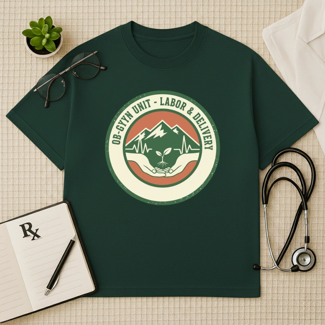 Celebrate the journey of life with our OB-GYN Labor & Delivery Unit Tee. This Gynecologist Oversized Graphic T-Shirt features a vintage mountain-inspired crest with a sprouting seed, symbolizing the growth and resilience found in the delivery room. A premium piece of Maternity Specialist Lifestyle Apparel, it offers a relaxed, modern fit for healers who guide their patients through the highest peaks of motherhood.