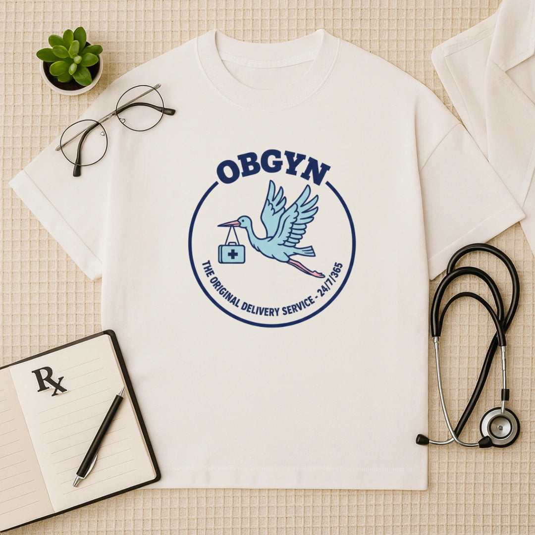 Celebrate the hustle of the labor room with our OBGYN Delivery T-shirt. Featuring a playful stork graphic, this tee pays homage to the "Original Delivery Service" that keeps the world going 24/7/365. As a staple piece of doctor lifestyle apparel, it offers the ultimate comfort for those long shifts or post-call coffee runs. This unisex medical oversized tee is designed for the high-performing healthpreneur who values both a mission-driven heart and a modern, relaxed fit.