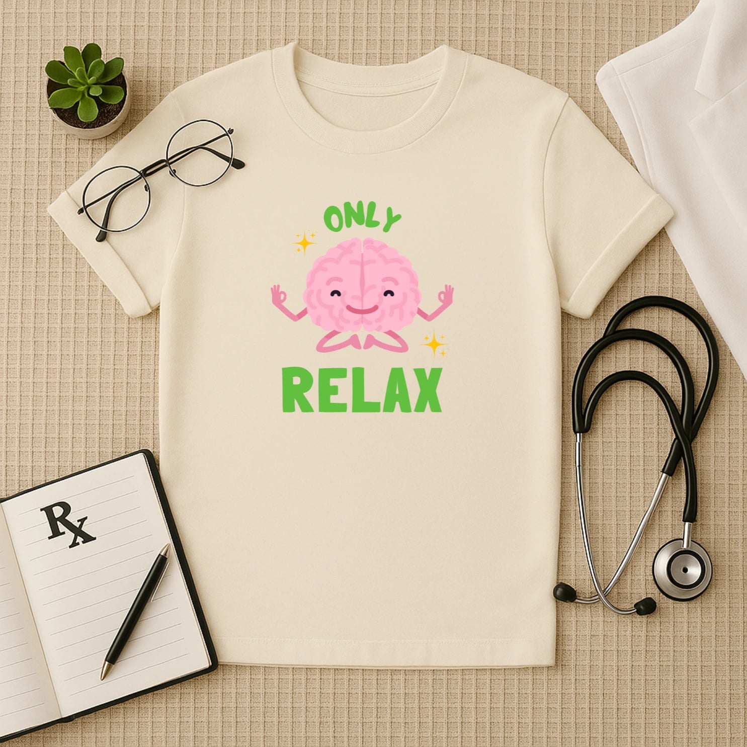 Take a deep breath and remind yourself to "ONLY RELAX" with this adorable T-shirt. Featuring a cute brain character in a peaceful meditation pose, this tee is a gentle nudge towards self-care and mental well-being. Comfortable and charming, it’s perfect for doctors, therapists, students, or anyone who needs a reminder to unwind.
