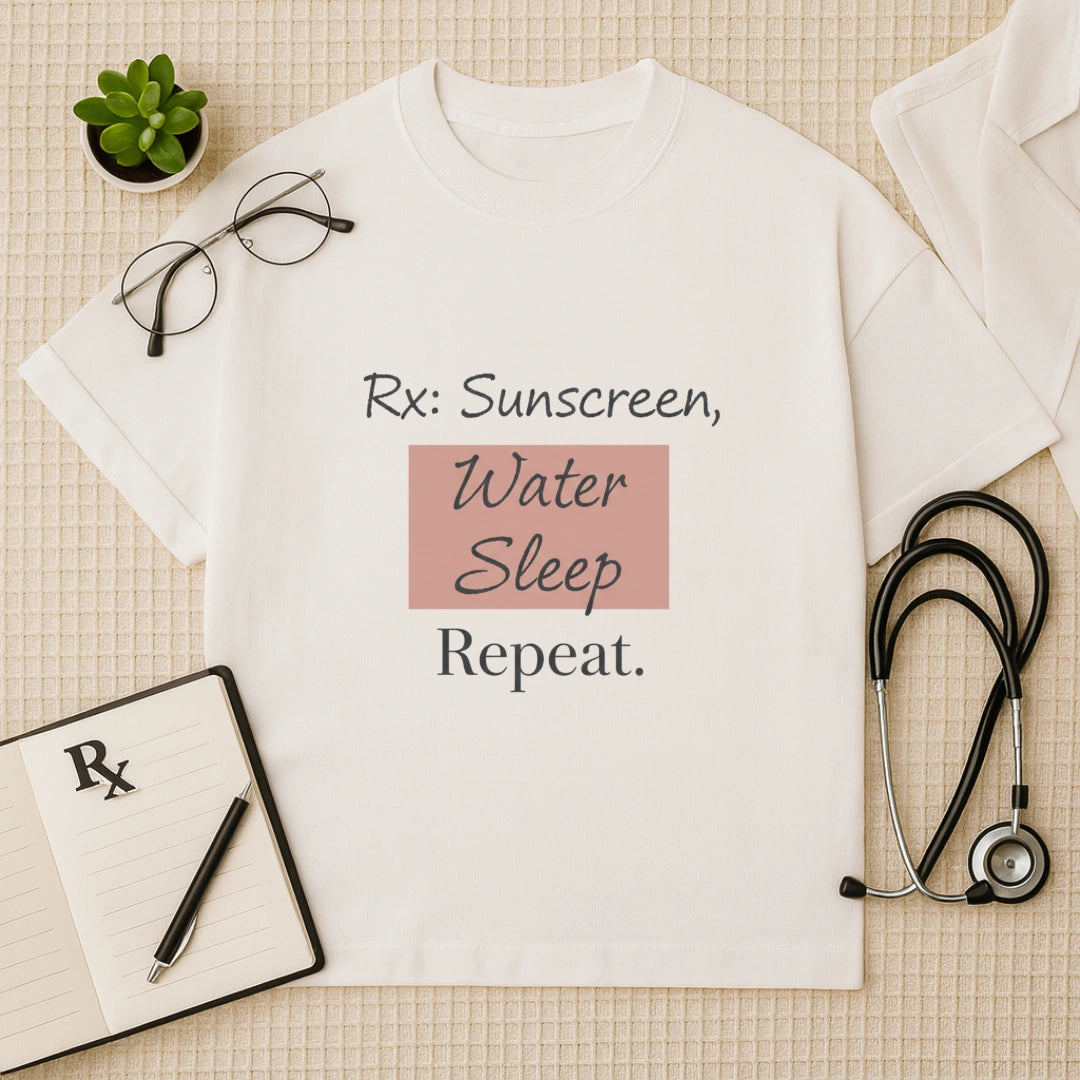 Master your daily routine with the Rx Sunscreen Dermatologist Tee. Featuring a clean, typographic "Rx: Sunscreen, Water, Sleep, Repeat" design, this clinical routine graphic shirt is the perfect conversation starter for doctors who advocate for holistic skin health. Designed for the "healthpreneur" army, this medical professional oversized apparel combines a professional message with a bold, Y2K-fuelled aesthetic. It’s the ideal uniform for those dedicated to healing the system while looking sharp in the clinic or on screen.