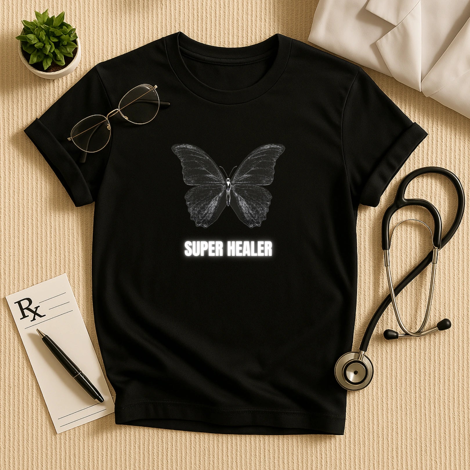 - Elegant Butterfly "Super Healer" Design – A symbolic and inspiring graphic.