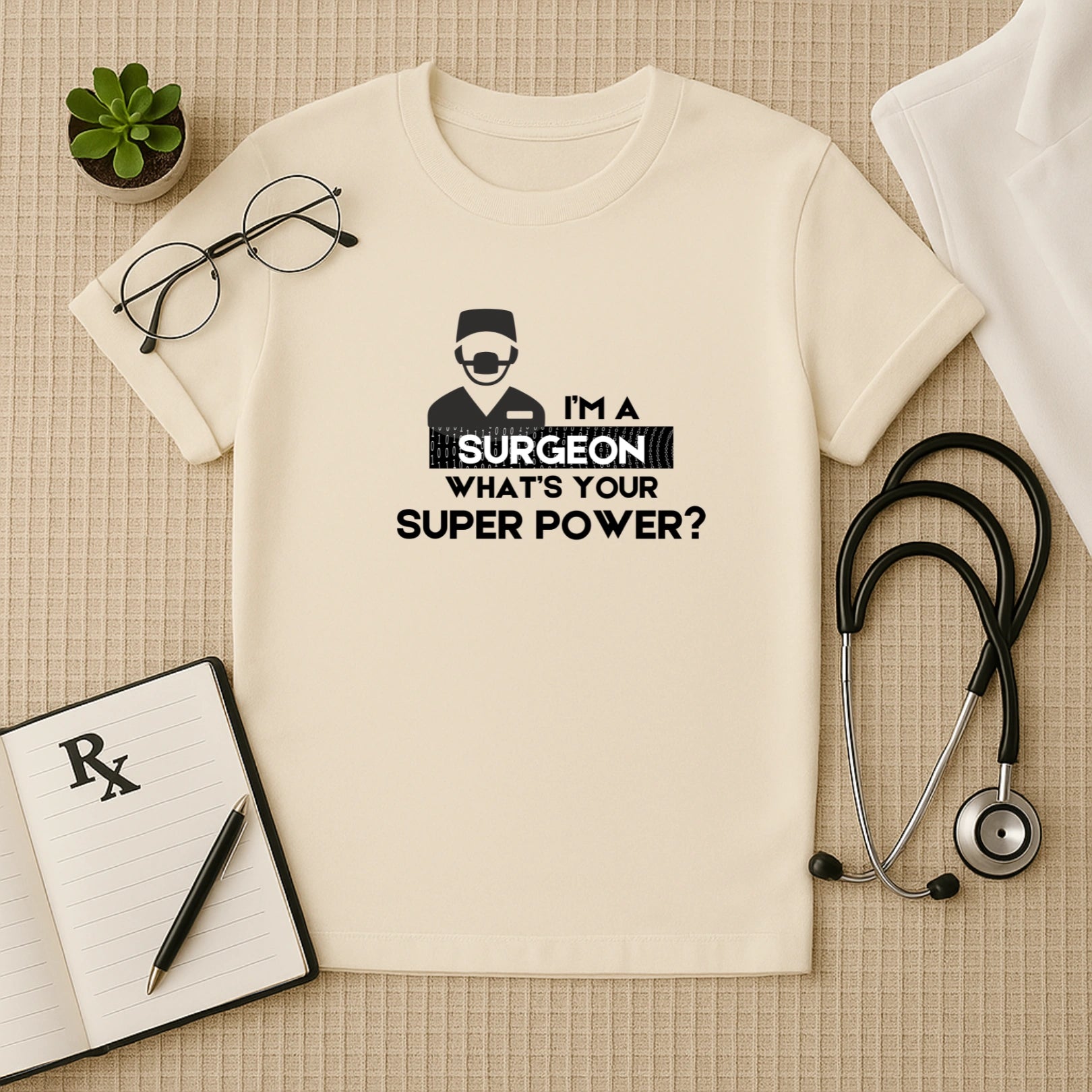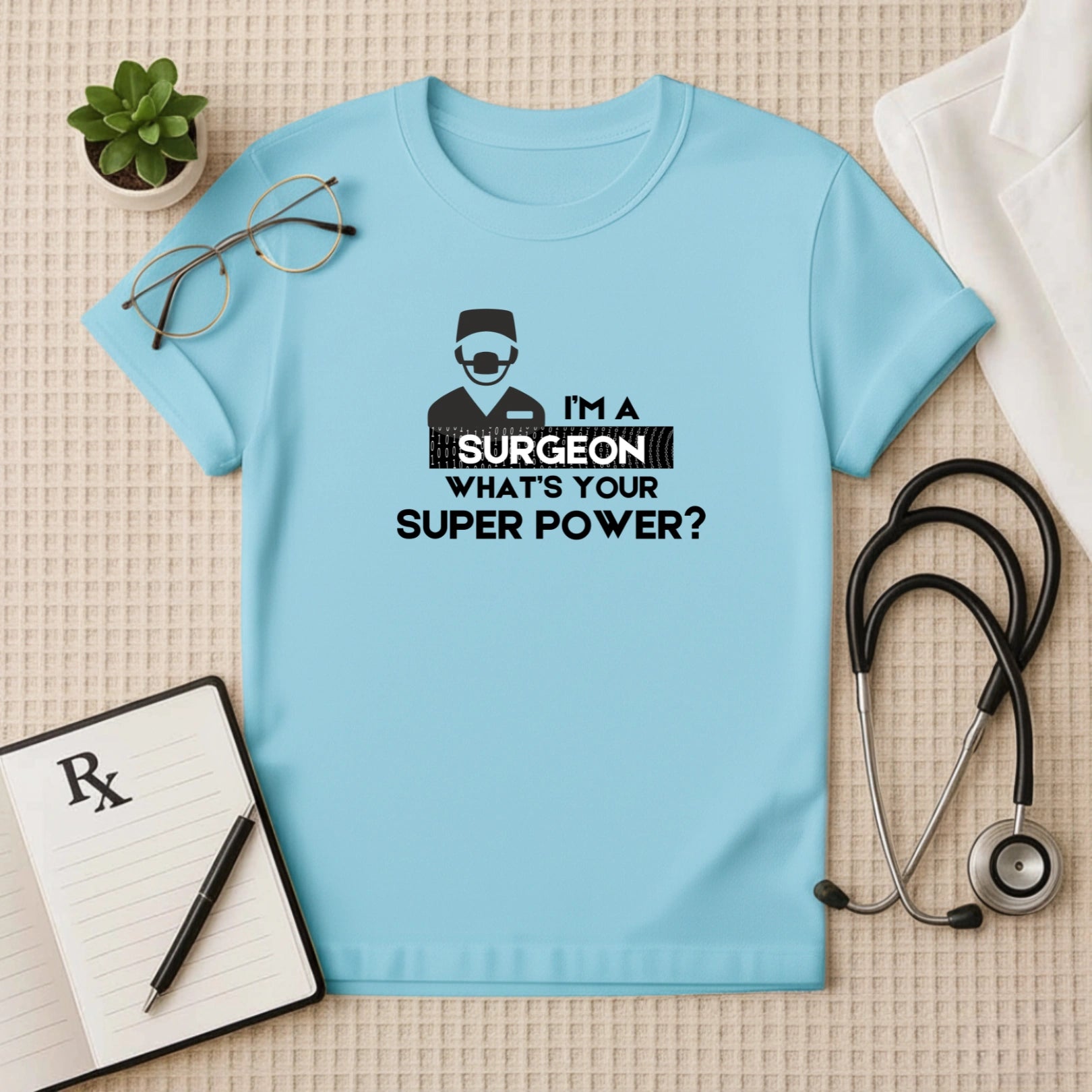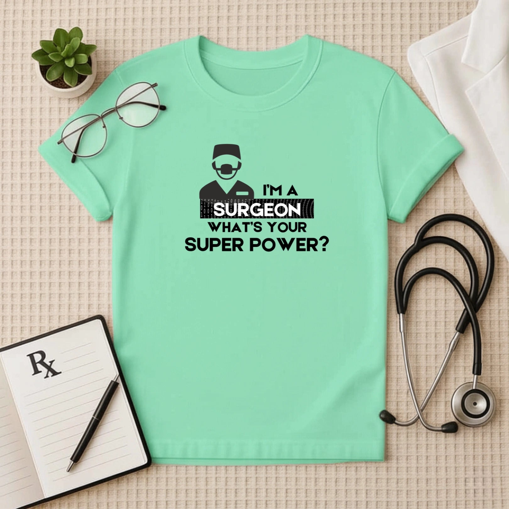 Unleash your inner superhero with our "I'M A SURGEON, WHAT'S YOUR SUPER POWER?" T-shirt! This bold and witty design celebrates the incredible skill and dedication of surgeons. Perfect for wearing your passion with pride, it’s a comfortable and stylish way to acknowledge the extraordinary work you do every day.
