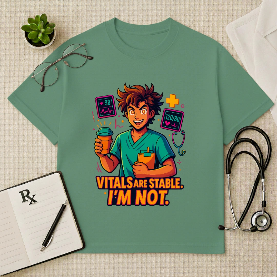 It's an honest diagnosis! This premium, unisex Oversized Doctor T-Shirt features a vibrant anime graphic and the relatable quote: "Vitals Are Stable. I'm Not." It’s the perfect humorous armor for any Medical Professional juggling shifts and coffee, and a great way for a Healthpreneur to show their real, human side.